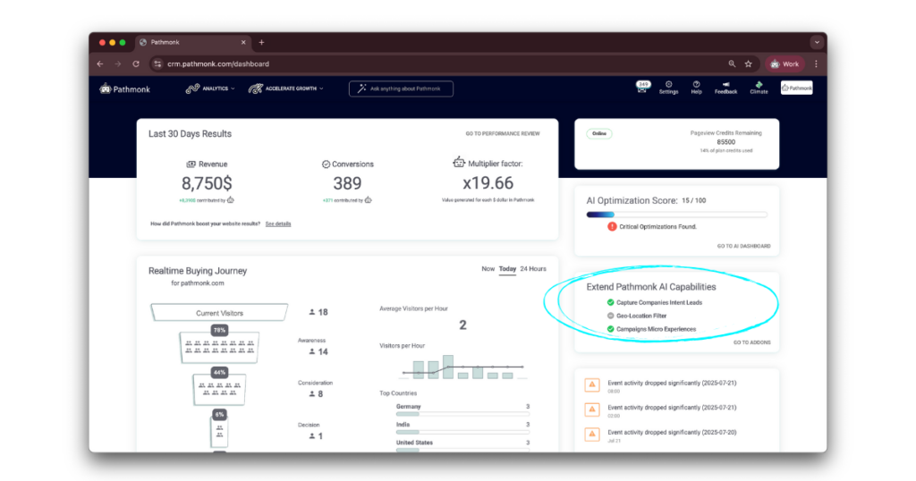 This is intentional. Pathmonk is fully privacy-compliant and doesn’t rely on cookies, form fills, or invasive tracking. Instead, it focuses on surfacing the intent and behavior of the company as a whole, so you can prioritize accounts that are actively showing interest, even if no one has raised their hand yet.